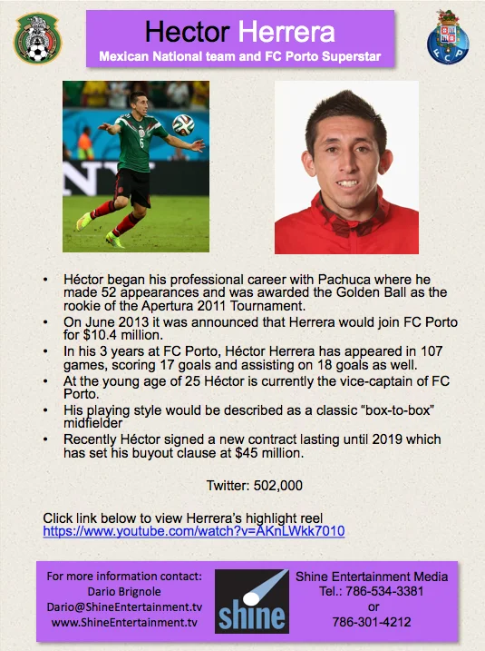 Héctor Herrera es un centrocampista mexicano que comenzó su carrera como jugador con Pachuca en 2011. Ganó el Balón de Oro como Novato de la Temporada de la Liga MX en 2011. En 2013, se trasladó al Porto FC en Portugal por 8 millones de euros. Herrera ha jugado más de 100 partidos con Porto y ha ganado el campeonato nacional portugués en la temporada 2017-18. Fue honrado como el mejor jugador del Porto FC durante la temporada 2014-15. Actualmente todavía juega para Porto.