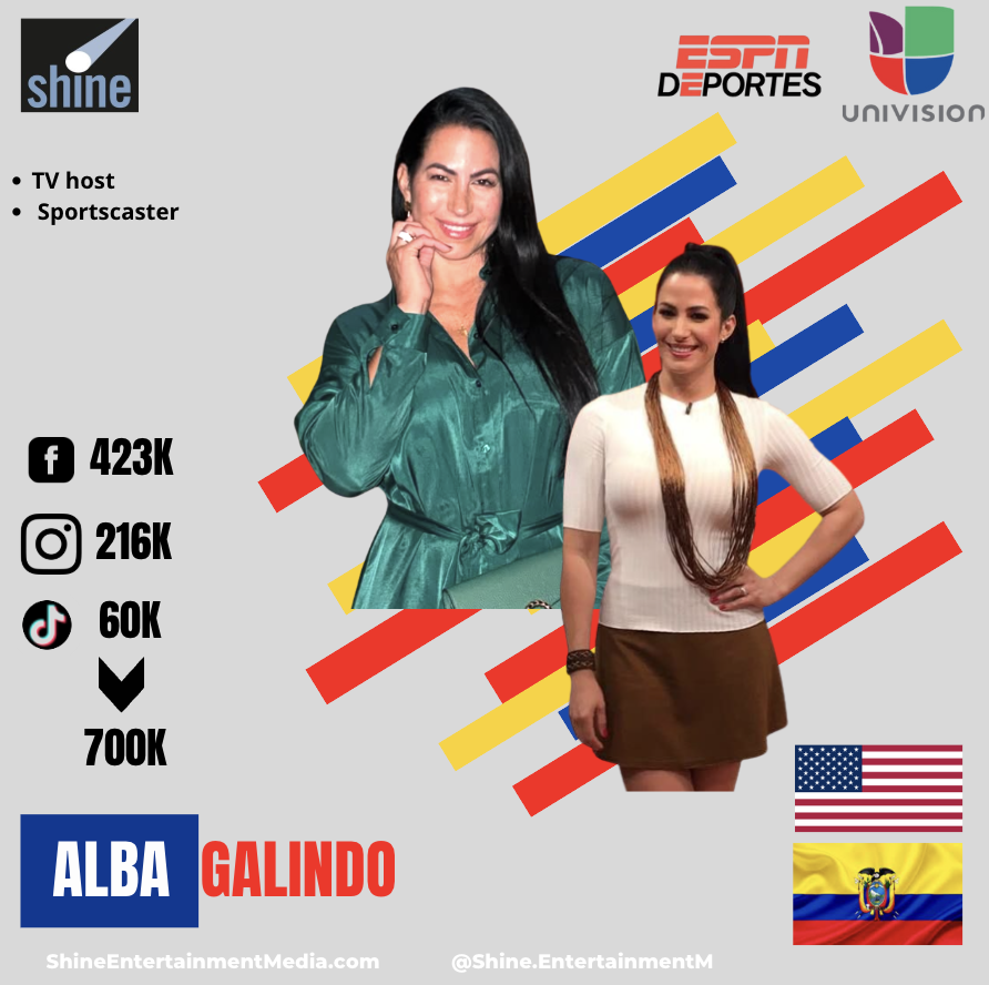 Actualmente Alba esta on ESPN. Alba Galindo ha estado en el mundo del modelaje desde hace más de 15 años, los últimos 10 en los Estados Unidos. Ella participó en el concurso de bikini de República Deportiva en el 2003 y ganó. Trabajó en varios programas conocidos de Univision apareciendo como modelo. En el 2006 República Deportiva la invito a participar en otro concurso, esta vez para ser una de las "Senadoras" en la República Deportiva. Desde el 2007 Alba participa en el tour nacional de Bud Light.