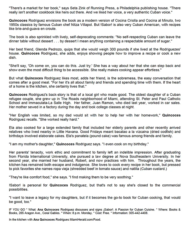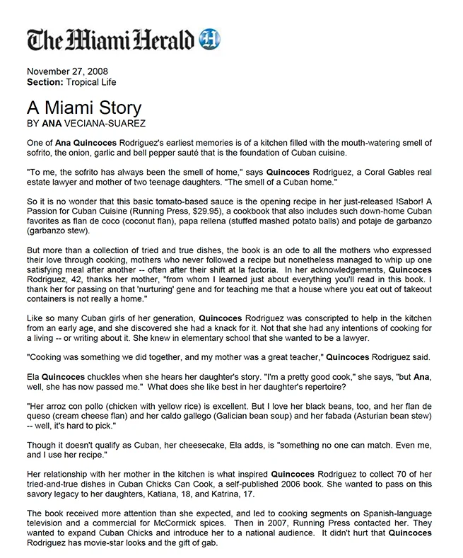 Ana Quincoces, votada como la "chef más caliente" de Miami, es bien conocida en los medios de comunicación y goza de una fuerte plataforma de medios sociales. Ana era miembro del elenco de las verdaderas damas de casa de Bravo de Miami Seasons 2 y 3. Apodado "el hombre del pensamiento de dama de casa", ya que fue capaz de extender su celebridad en una próspera empresa que incluye programas de televisión y apariciones, varios libros de cocina, y su propia línea de cultivo de productos alimenticios Skinny Latina ®, así como el endoso se ocupa de algunas de las marcas más grandes del mundo, incluyendo Target, Unilever, Olay, Smithfield, Nestlé y otros. Como finalista en la temporada más reciente de Food Network Star, Ana recibió gran elogio por su talento culinario. Además de lograr el estatus de "Bravo-lebrity" "sobre las damas de casa reales y la credibilidad de los alimentos serios de los mejores chefs del país en la estrella de la red de alimentos.