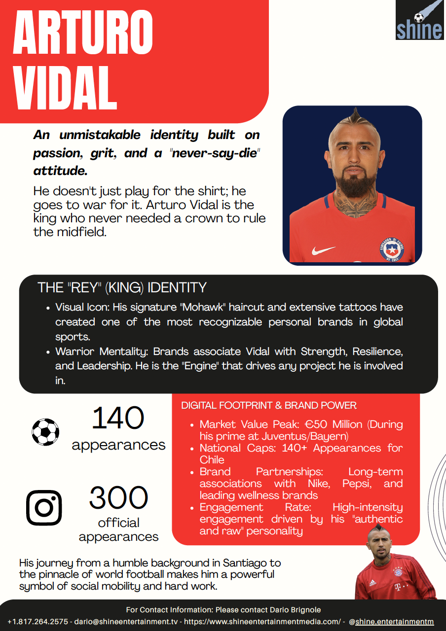 Arturo Vidal es un futbolista profesional chileno que juega como centrocampista del Bayern Múnich y de la selección de Chile. Vidal comenzó su carrera en Colo-Colo en 2005, allí ganó tres trofeos hasta ser transferido a Bayer Leverkusen en 2007 por 11 millones de dólares, que en ese momento era el récord nacional de una tarifa de transferencia. Jugó para Leverkusen durante cuatro años hasta que se unió a la Juventus en 2011 por 11,5 millones de euros. En su época en la Juve, Vidal ganó cuatro Scudettos, una Coppa Italia y dos Supercoppa italiana. Luego regresó a Alemania para jugar en el Bayern Múnich por una tarifa de más de 37 millones de euros. Ha ganado tres Bundesliga y una copa alemana. Durante su tiempo en la selección chilena que comenzó en 2007, ha participado en un Mundial, una Copa de Confederaciones y cuatro Copa Américas. Ganador de dos Copa Américas (2015,2016) y subcampeón de la Copa de las Confederaciones (2017).
