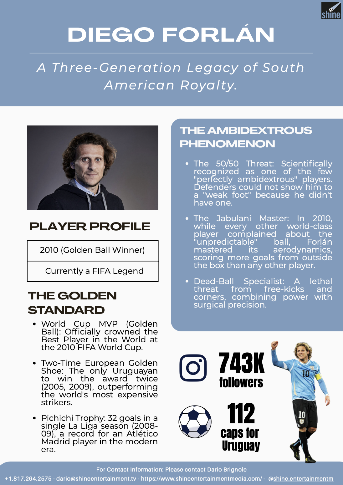 Diego Forlán is currently active as a football analyst and commentator, appearing at international events and FIFA-related activities. He is also involved in football development initiatives and frequently participates as a global ambassador and former World Cup star.