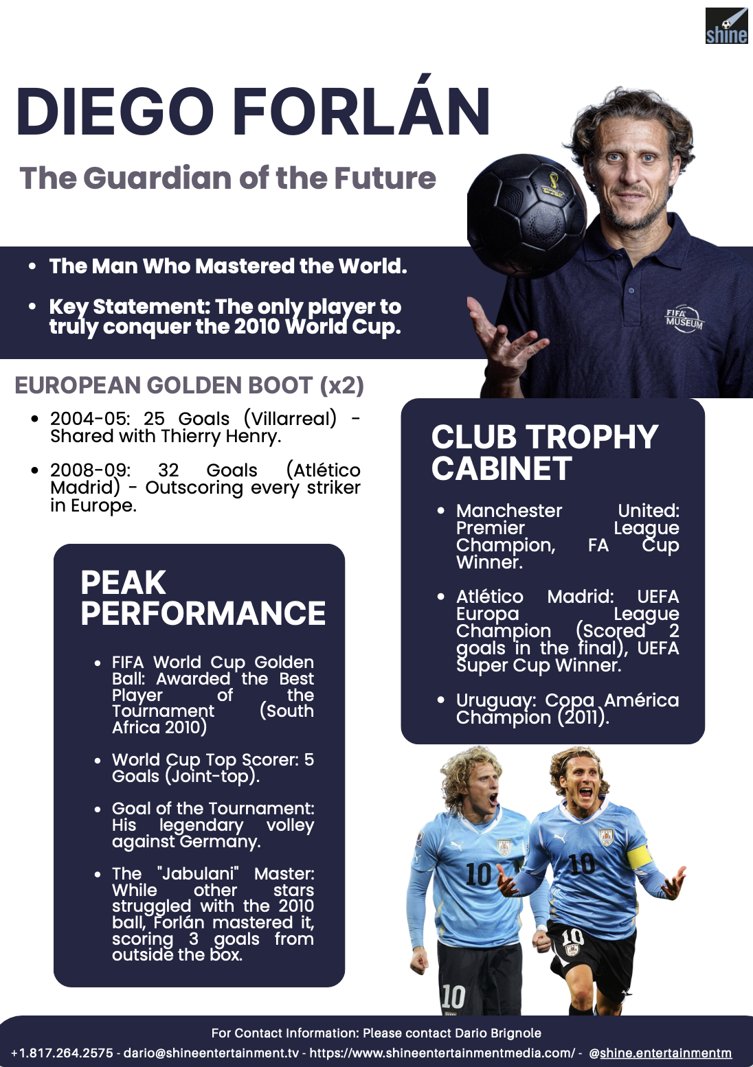 Diego Forlán is one of Uruguay’s most iconic footballers. He enjoyed a successful European career with Manchester United, Villarreal, and Atlético de Madrid, winning the UEFA Europa League and two European Golden Boots. He was named Best Player of the 2010 FIFA World Cup, earning the Golden Ball award.