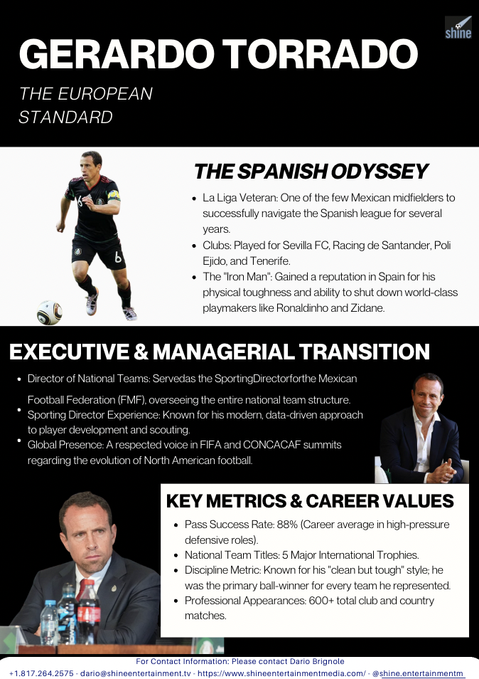Geraldo Torrado es un mediocampista mexicano retirado que jugó en muchos clubes de todo el mundo y por la selección de México. Torrado comenzó su carrera profesional en 1997 con Pumas, donde jugó hasta el año 2000, cuando se trasladó a España. En España jugó para Tenerife, Ejido, Sevilla y Racing de Santander. Regresó a México para jugar para Cruz Azul en 2005. Pronto se convirtió en capitán y se quedó en el club por 10 años. Se mudó a Indy Eleven en 2016 y se retiró en 2017. Torrado tiene más de 140 apariciones con el equipo nacional y ganó 3 Copas de Oro y una Copa Confederaciones. Actualmente ocupa el segundo lugar en la mayoría de las apariciones de El Tri.