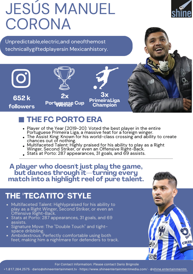 Jesús Corona es un futbolista profesional mexicano que juega como delantero para el club FC Porto el equipo nacional mexicano.Corona comenzó su carrera con Monterrey e hizo su debut profesional a los 17años. Tras cuatro temporada con Monterrey, Corona fue transferido al F.C.Twente, que firmó un contrato de cuatro años. Corona también ayudó a Méxicoa ganar el Campeonato de 2013 CONCACAF U-20 acogió en su casa, en el queanotó un gol en la final contra Estados Unidos. Él es debut con la selecciónnacional en noviembre de 2014, proporcionando la ayuda de Carlos Vela en el gol de México segundo en el eventual triunfo de 3-2 sobre los holandeses.Corona es comúnmente conocido como "El Tecatito."