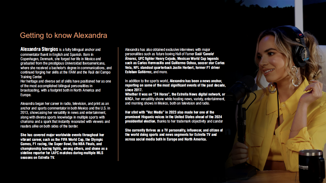 Desde exclusivas junto al ring hasta noticias políticas de última hora, o encontrando el taco perfecto en la Ciudad de México o el mejor sushi en Los Ángeles, Alexandra vive la vida en voz alta. Conecta personas y culturas, rompiendo barreras con una sonrisa y un micrófono.