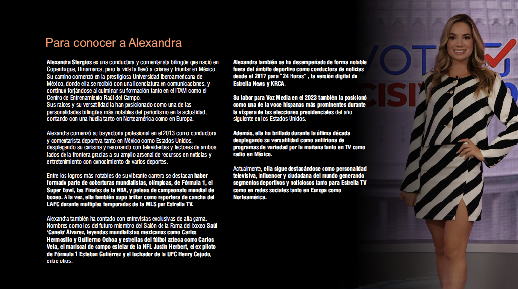 Alexandra Stergios es mucho más que una presentadora de noticias; es una fuerza de la naturaleza. Combinando la integridad periodística con la apasionada energía de sus raíces mexicanas, aporta dinamismo y emoción a cada historia.