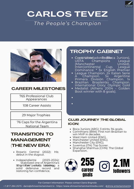 Carlos Tevez es uno de los delanteros más emblemáticos de Argentina, reconocido por su carácter, liderazgo y mentalidad ganadora. Fue campeón en Inglaterra e Italia, ganó la UEFA Champions League con Manchester United y disputó tres Copas del Mundo con la selección argentina.