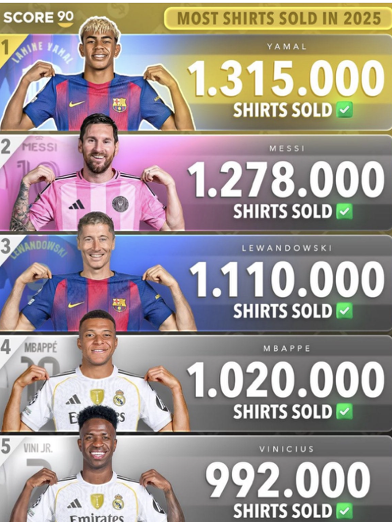Leading the 2025 jersey sales chart is FC Barcelona’s young phenomenon, Lamine Yamal, with an estimated 1.3 million shirts sold, surpassing even global icon Lionel Messi. This astounding figure underscores the power of a generational talent inheriting an iconic number. The transfer of the legendary No. 10 jersey to the young winger was not just a symbolic gesture, it was a trategic triumph of marketing. In the first 48 hours following the announcement of his new number, an estimated 70,000 shirts were sold worldwide, generating an immediate revenue boost of around €10 million for the club. This single event set a record for the highest-selling shirt in the club's history over a short period.