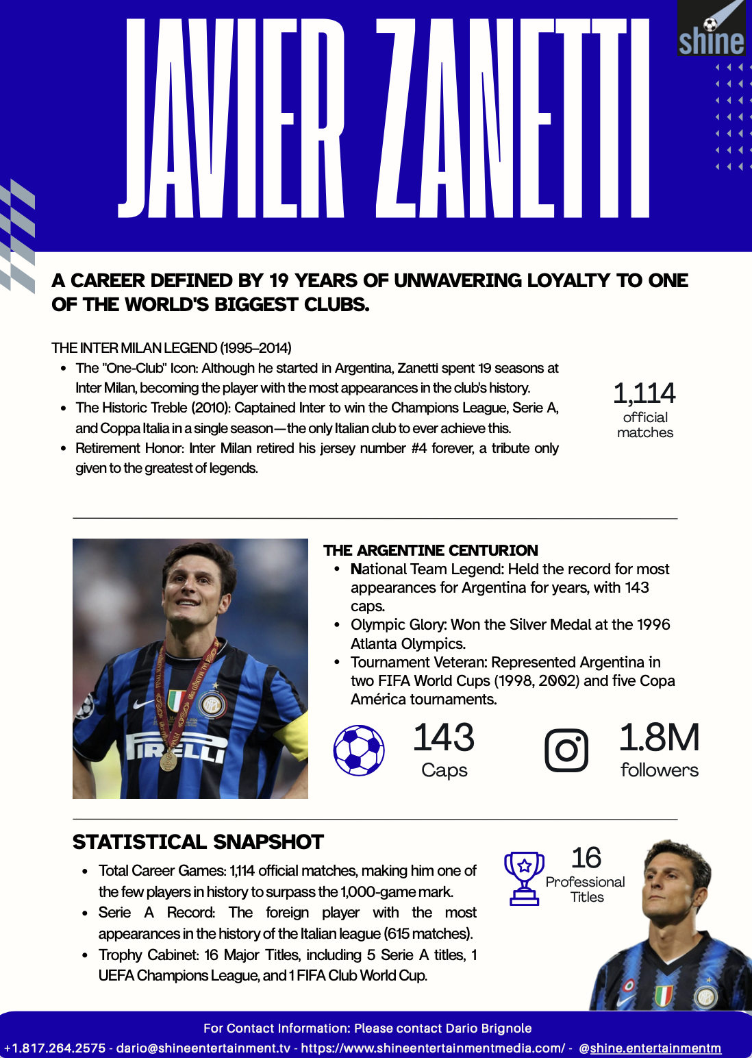 Javier Zanetti es una de las grandes leyendas del Inter de Milán y del fútbol argentino. Jugó más de 850 partidos como profesional, la mayoría con el Inter, donde ganó múltiples títulos de Serie A y la UEFA Champions League en 2010. Fue capitán histórico del club y representó a la selección argentina en Copas del Mundo y torneos internacionales.