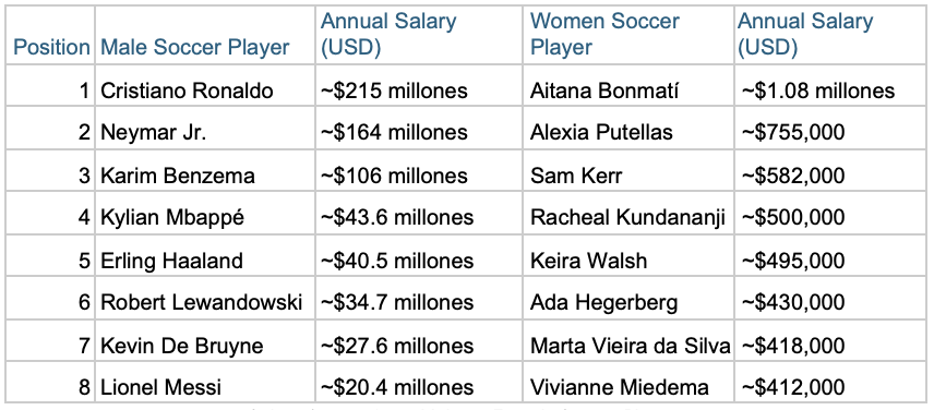 The following table shows the salary differences between the top-paid male and female soccer players:
