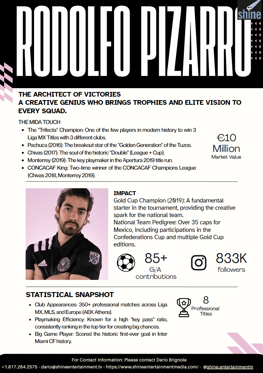 Rodolfo Pizarro es un mediocampista ofensivo mexicano reconocido por su técnica y creatividad. Ha sido campeón de Liga MX con Pachuca, Chivas y Monterrey, además de ganar la Liga de Campeones de CONCACAF. También ha representado a la selección mexicana en torneos internacionales y tuvo experiencia en la MLS con Inter Miami.