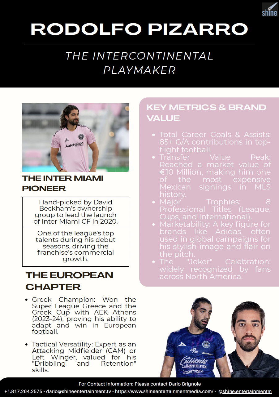 Rodolfo Pizarro is a Mexican attacking midfielder known for his technical skill and creativity. He won Liga MX titles with Pachuca, Chivas, and Monterrey, as well as the CONCACAF Champions League. He has represented the Mexican national team in international tournaments and also played in MLS with Inter Miami.