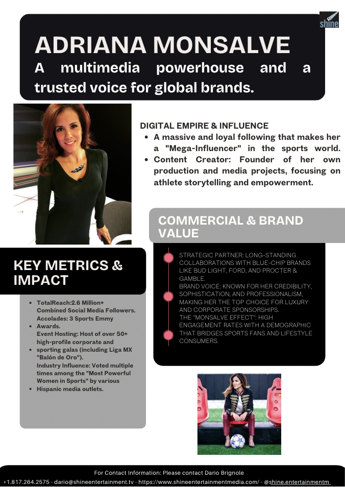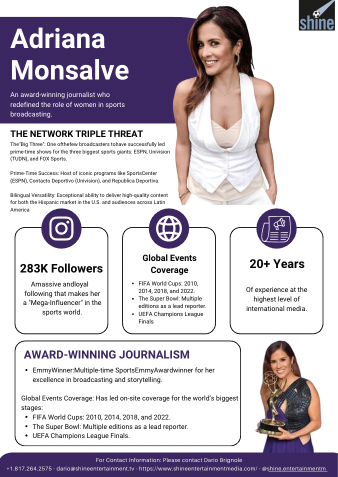Adriana Monsalve is a well-known Venezuelan sports journalist with a strong career in international television. She has worked with major networks such as Univision and ESPN, becoming one of the most influential female voices in Latin sports media, covering football, major tournaments, and global sporting events.